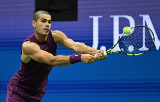 8月27日,阿尔卡拉斯在比赛中回球。新华社记者 李睿 摄