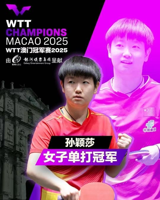 9月14日,WTT世界乒联澳门冠军赛女单决赛,中国队选手孙颖莎以4-3战胜队友王曼昱 ,夺得冠军,王曼昱获得亚军。