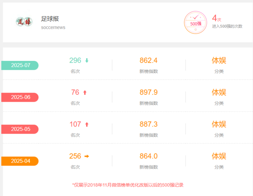 自2014年9月起,新榜首创推出中国微信500强系列数据榜单,至今已成为行业内极具权威性与影响力的评估标准,备受广告主、代理公司及投资人的高度关注,成为广告投放与投资决策的重要定价参考。该榜单评选机制严谨且独特,为确保榜单的科学性与公正性,新榜在月榜及年榜制作过程中,实施数据回采,将日榜统计截止时间后的后续传播数据纳入其中,从而全面展现公众号在较长周期内的真实传播价值。同时,新榜坚信内容分类对于排行榜的关键意义,在打破内容类别进行跨界对比的月榜中,特意引入类别权重,以呈现契合社会主流价值的中国微信 500 强生态格局。此次《足球》报入围,正是在严苛评选机制下,凭借过硬实力脱颖而出。