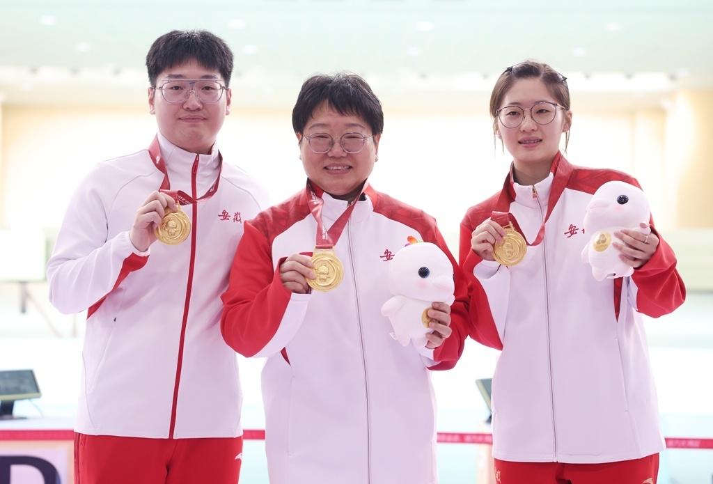 在当天的“压轴戏”——10 米气手枪混合团体决赛中,安徽一队胡凯/姚千寻以资格赛592环的成绩创全国纪录、超亚洲纪录、世界纪录,并最终以17比9战胜山东二队夺得金牌;该项目原全国纪录为588,亚洲和世界纪录 587环。