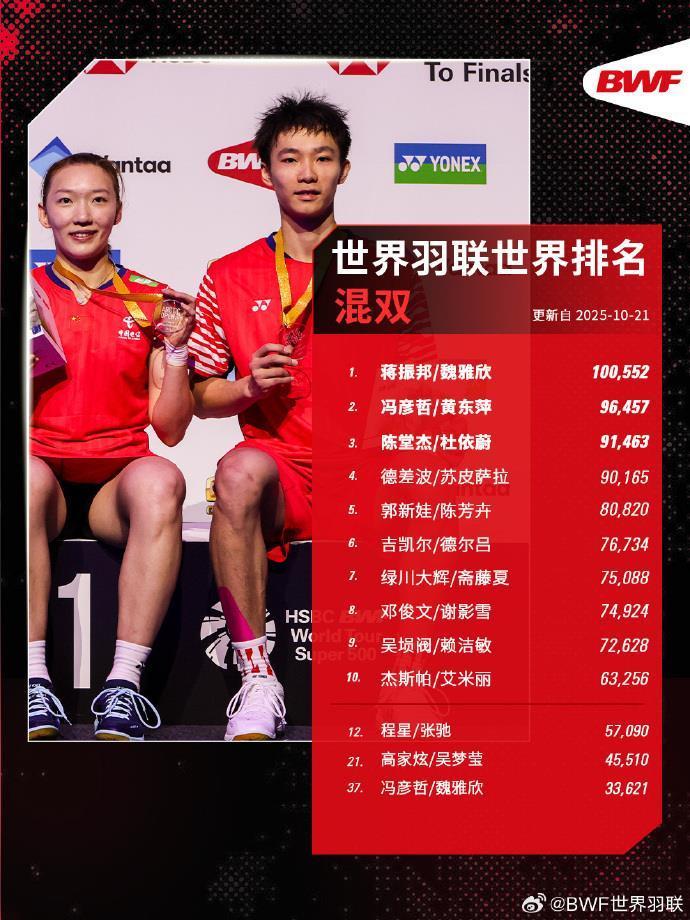 世界羽联2025年第43周世界排名揭晓,中国队强势包揽三项世界第一:石宇奇(男单)、刘圣书/谭宁(女双)、蒋振邦/魏雅欣(混双)均以10万+高分继续领跑各单项第一。