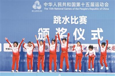 广东女子跳水队在领奖台上庆祝夺冠。广州日报全媒体记者 杨泽彬 摄