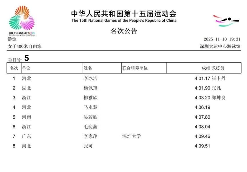 11月10日,中华人民共和国第十五届运动会游泳比赛在深圳大运中心游泳馆拉开序幕。在女子400米自由泳决赛中,河北队的李冰洁以4:01.17的成绩获得第一名,湖北队的杨佩琪获得第二名,浙江队柳雅欣获得第三名。广东队李家萍获得第七。