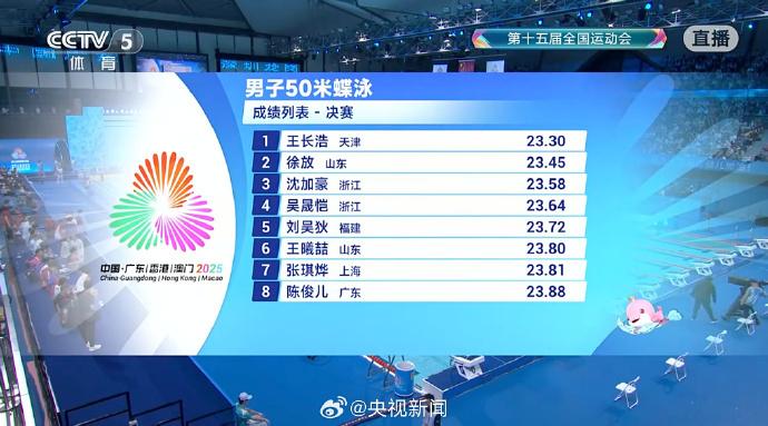 第十五届全运会男子50米蝶泳决赛,王长浩代表天津队出战,以23秒30的成绩夺得冠军。点赞!