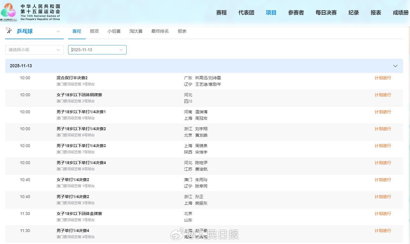 13日,2025全运会乒乓球继续进行,成年组进行单打1/4和混双半决赛。