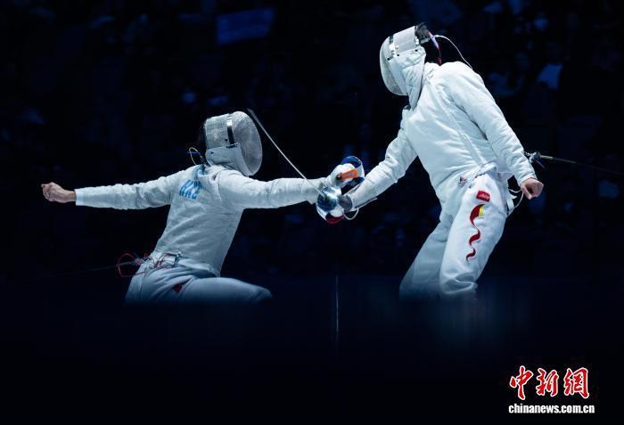 11月15日,第十五届全国运动会击剑赛事在香港启德体育园体艺馆开赛,香港队选手何思朗获得男子佩剑个人赛银牌。图为何思朗(左)在男子佩剑个人赛决赛中进攻。中新网记者 侯宇 摄