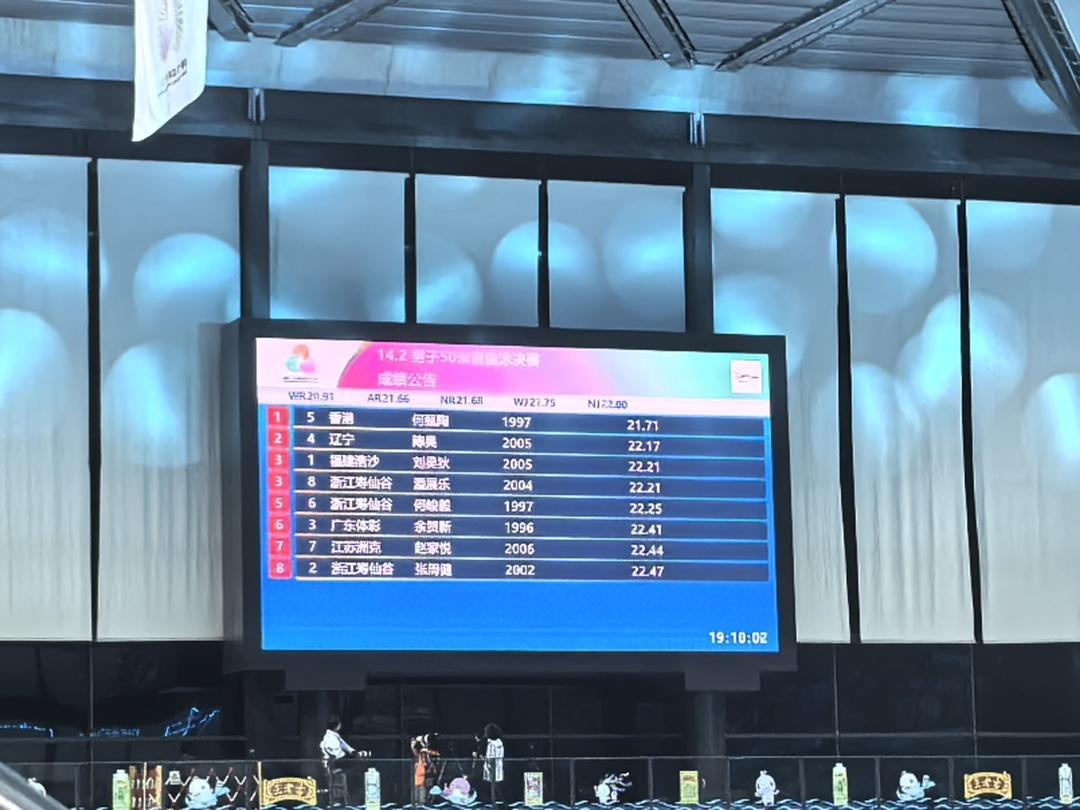 11 月 16 日, 十五运会男子50米自由泳决赛,香港队何甄陶以 21.71 秒成绩力压潘展乐夺冠。第二名是辽宁队陈昊,浙江队潘展乐和福建刘吴狄并列第三名。