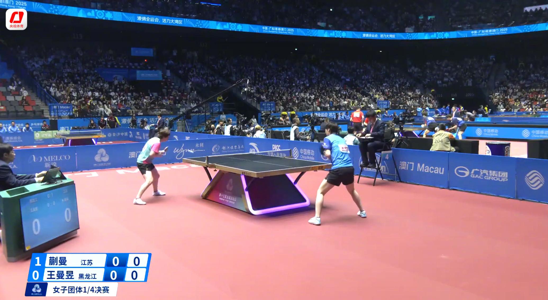 第十五届全运会乒乓球女团1/4决赛,王曼昱 、张瑞 、范姝涵所在的黑龙江队战胜蒯曼、钱天一、石洵瑶所在的江苏队,晋级半决赛。加油!