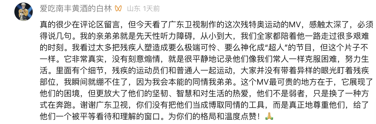 2025残特奥会会歌《共赴山海》MV由广东卫视林维桦团队担纲,一幕幕感人画面,一条条暖心评论的背后,是“让残障群体被看见”“让大湾区精神被感知”核心思想的真实呈现,既展现运动员的热血坚韧与社会包容尊重,也诠释‘追梦大湾区,出彩人生路’的核心主题,紧扣残特奥会‘平等、参与、共享、融合’的理念。