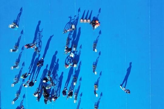 11月26日下午2点至4点,运动员进入赛场进行赛前演练,熟悉比赛路线。图为选手们在游泳上岸后直接进入换项区,准备自行车赛。