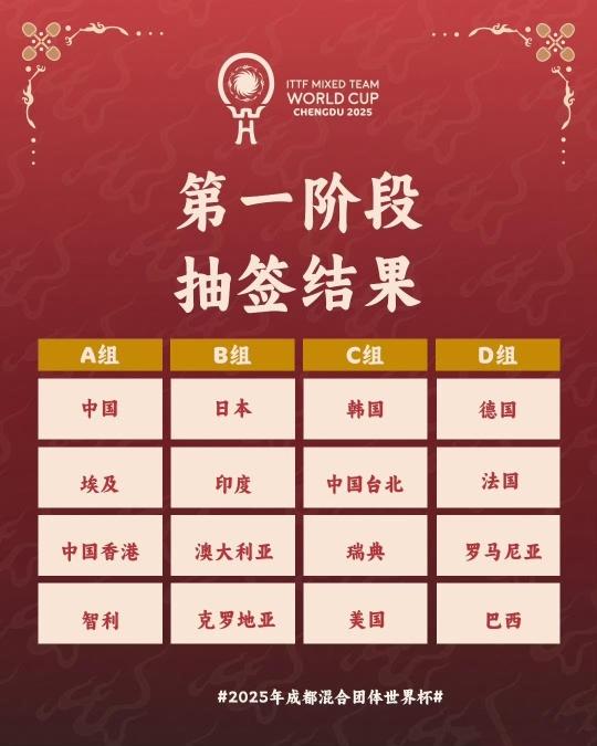 北京时间11月29日,2025年成都国际乒联混合团体世界杯第一阶段抽签仪式举行。根据抽签结果,中国队最终与中国香港队、埃及队以及智利队同组。
