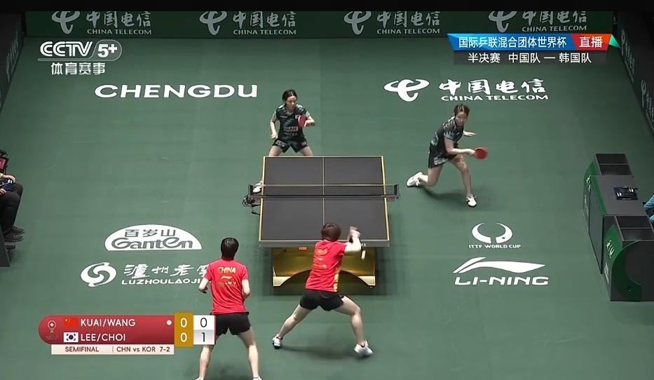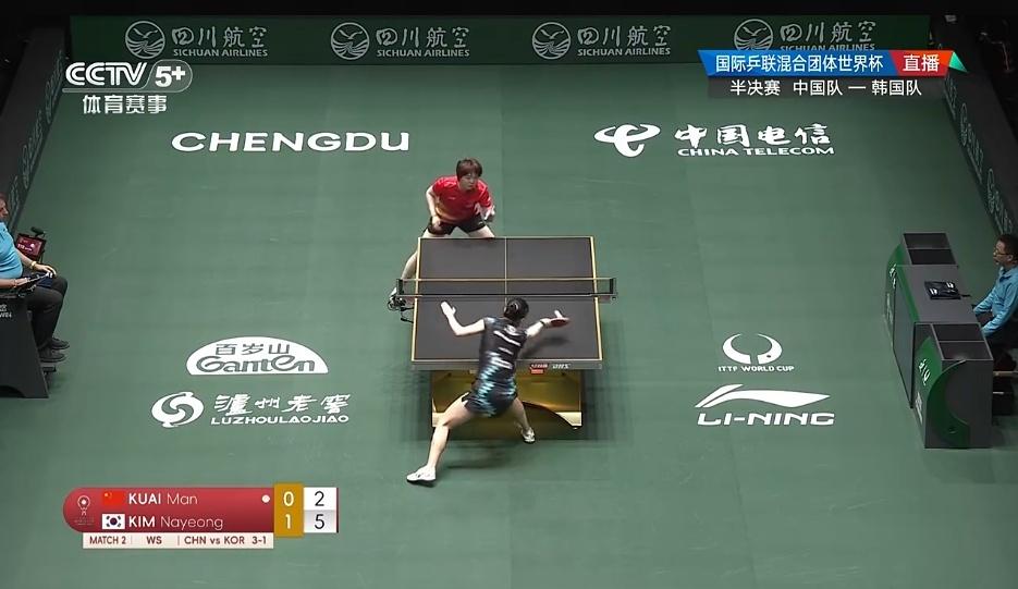 第四场女双比赛,蒯曼/王曼昱1-1战平李恩惠/崔孝珠,两局比分为:5-11、14-12。最终,中国队大比分8-3击败日本队。