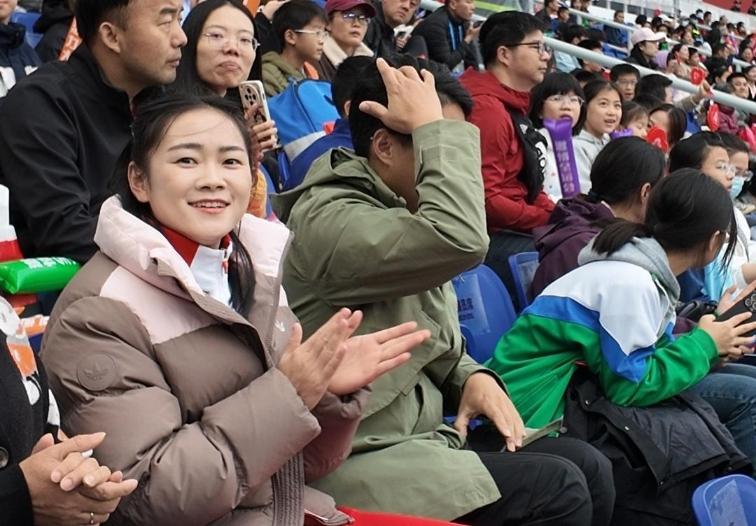 由于天气降温,梁小静穿着棉衣亮相奥体看台,但还是被眼尖的观众认出,她对签名和合影诉求来者不拒,非常和善亲民。