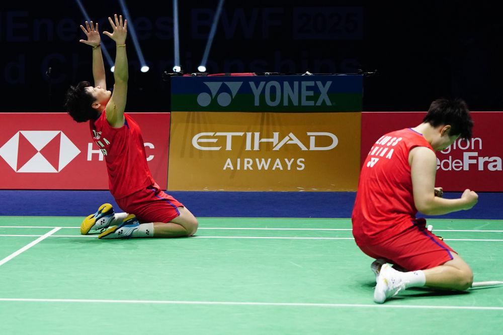 8月31日,在法国巴黎举行的2025年世界羽毛球锦标赛女子双打决赛中,中国组合刘圣书/谭宁(左)2:1战胜马来西亚组合陈康乐/蒂娜,获得冠军。图为刘圣书/谭宁在获胜后庆祝。新华社发