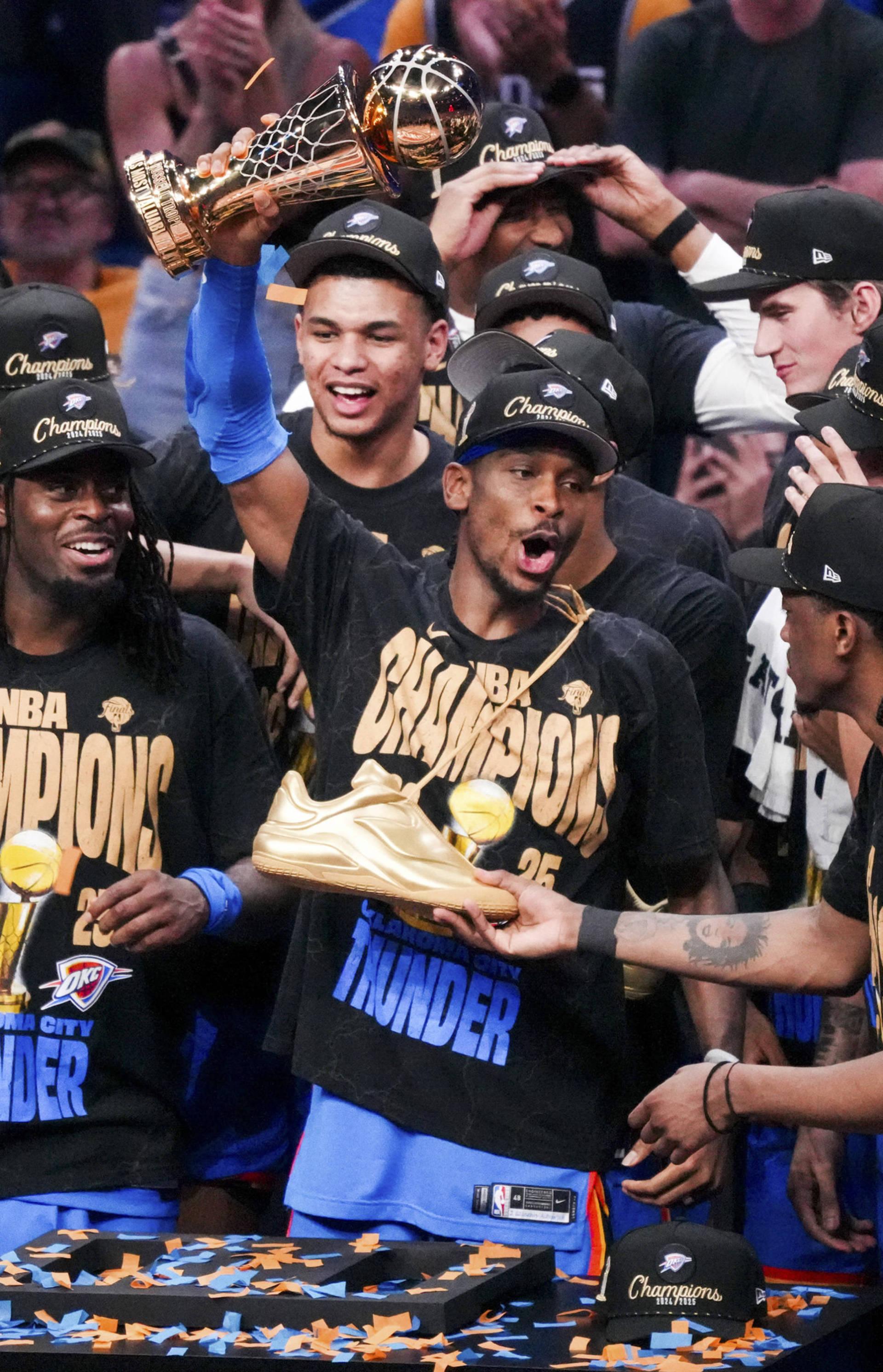 这是2025年6月22日,俄克拉荷马城雷霆队球员吉尔杰斯-亚历山大(前中)当选总决赛最有价值球员(FMVP)。 新华社发(孙宇轩摄)