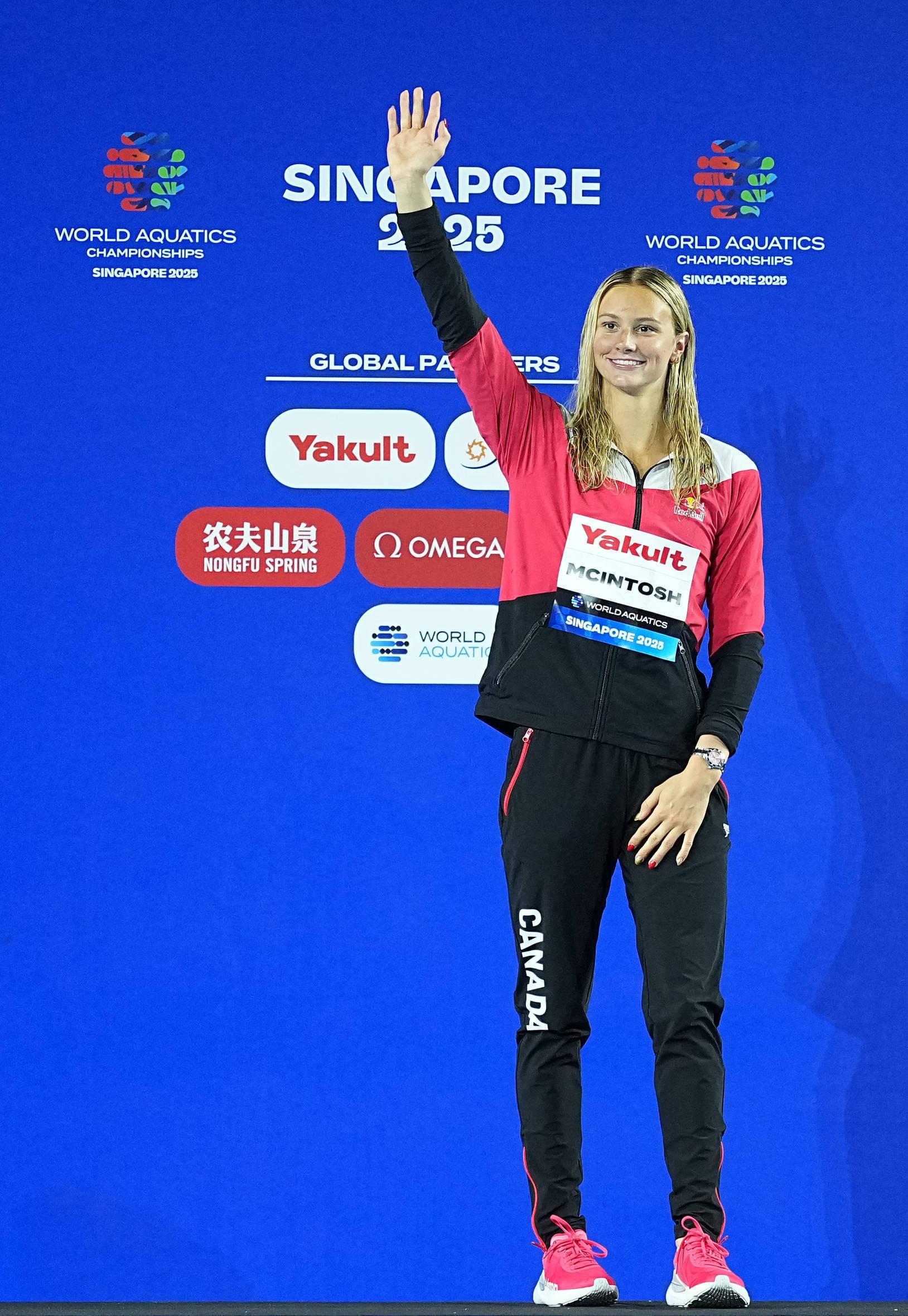 这是2025年7月31日,冠军加拿大选手麦金托什在2025年世界游泳锦标赛游泳女子200米蝶泳颁奖仪式上。 新华社记者 薛宇舸 摄