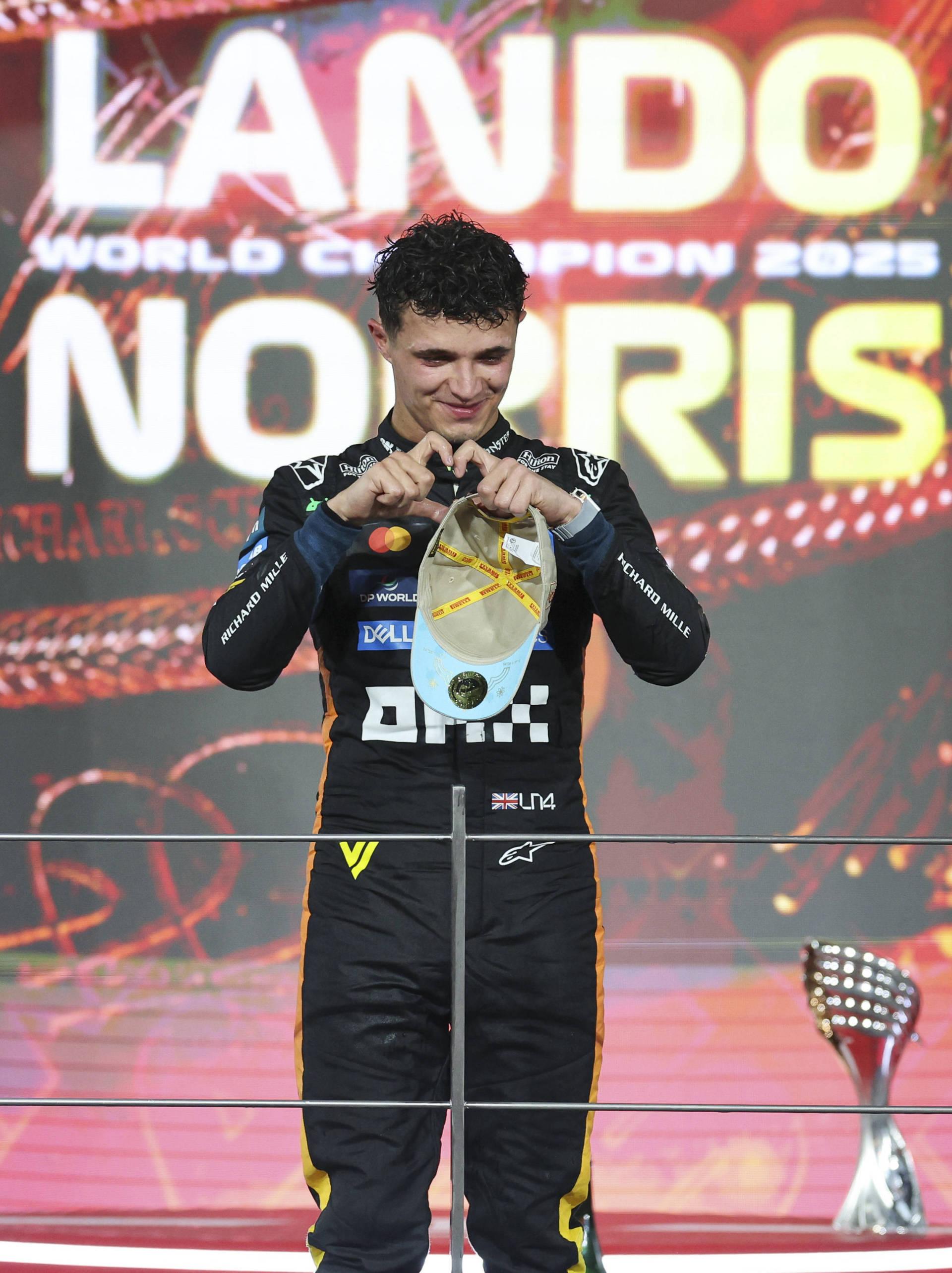 这是2025年12月7日,迈凯伦车队英国车手诺里斯在职业生涯首次加冕F1车手总冠军后庆祝。 新华社发(诸行健摄)
