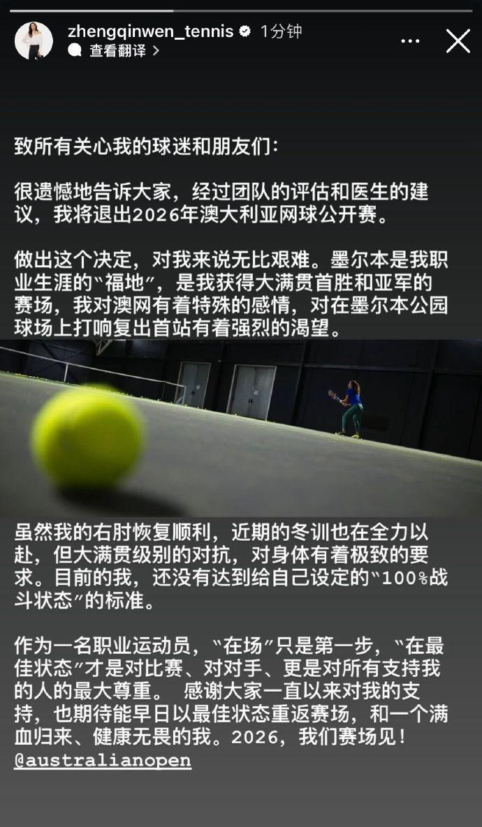新华社武汉1月8日电 中国网球名将郑钦文8日在社交媒体平台宣布退出2026年澳大利亚网球公开赛。她在声明中表示,目前的自己还没有达到“100%战斗状态”的标准,期待早日以最佳状态重返赛场。