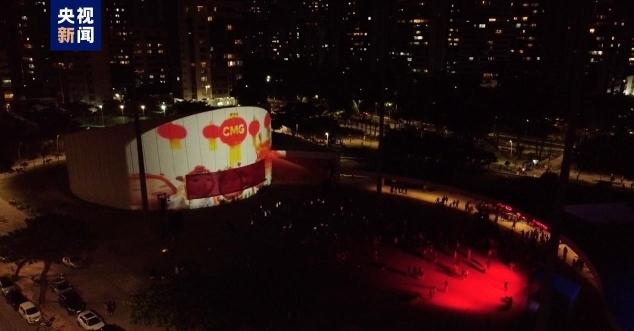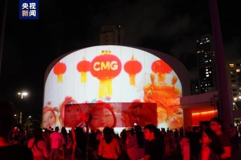 △中央广播电视总台龙年春晚动画宣传片以灯光秀的形式投放在多娜·琳杜公园内剧院的外墙上