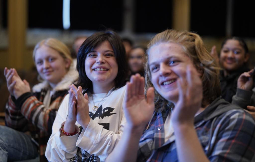 1月30日,在美国华盛顿州塔科马市林肯中学,将于3月启程赴华交流的林肯中学12年级学生蒙特塞拉特·罗梅罗-罗查(中)参加美国中学生赴华交流欢送仪式。新华社记者 吴晓凌 摄