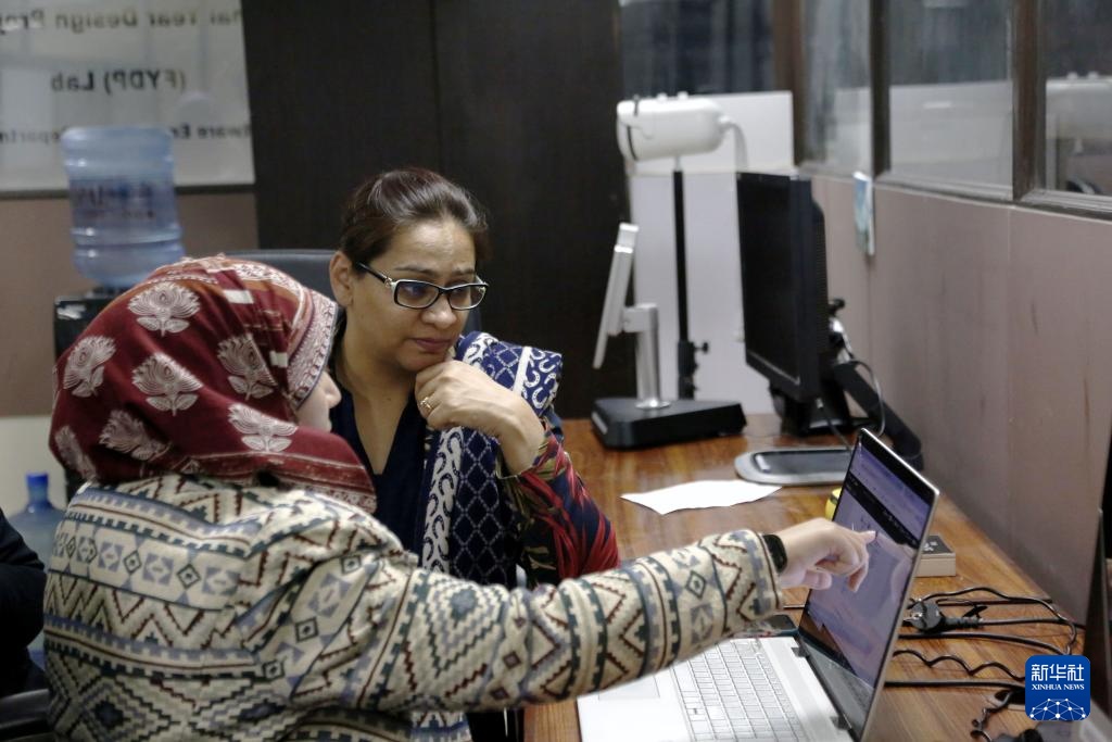 1月19日,在巴基斯坦伊斯兰堡国立科技大学的中巴智能系统实验室内,实验室巴方负责人、巴基斯坦国立科技大学电气工程与计算机科学学院副教授西马卜·拉蒂夫(后)与学生交流。新华社发(艾哈迈德·卡迈勒摄)