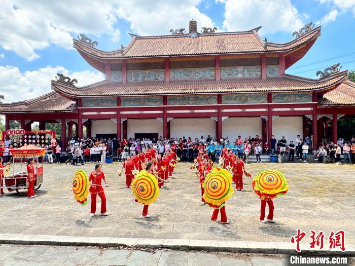 当地时间2月11日,巴西观音寺,福建籍侨胞在寺院建筑群里表演精彩的阵头艺术,并共同参与千人祈福。巴西华人华侨电商总会供图