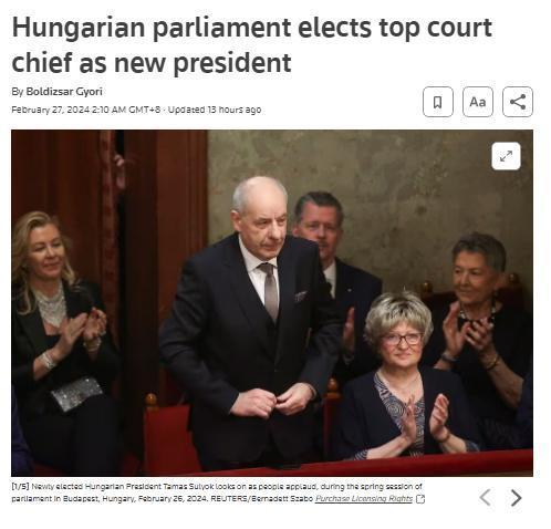 中新网2月27日电 据美联社、路透社报道,当地时间26日,匈牙利国会选举匈牙利宪法法院院长舒尤克·道马什为匈牙利总统。