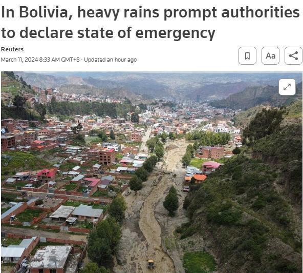 据此前报道,自3月开始,拉巴斯遭遇持续降雨,山体滑坡、洪水、泥石流等自然灾害多发。官方数据显示,自1月雨季开始以来,玻利维亚全国各地已有近50人死于洪水。