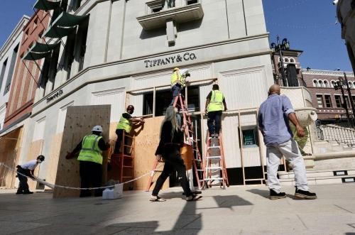 2020年11月2日,美国洛杉矶县贝弗利山市商业区的商家将店铺门窗封上。为应对当时美国大选可能出现的抗议或骚乱,贝弗利山市不少商业区加强防护和安保。 新华社发