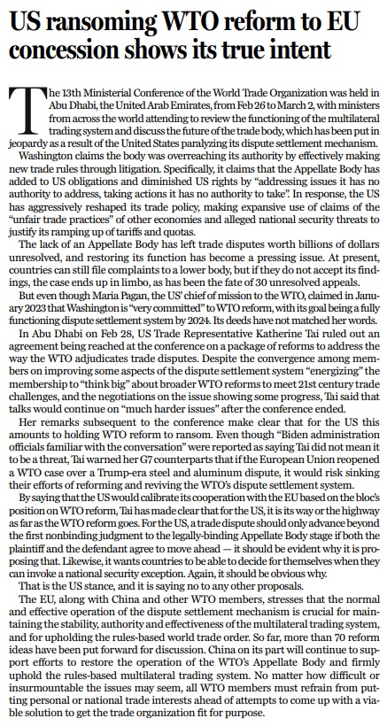 原标题:US ransoming WTO reform to EU concession shows its true intent
