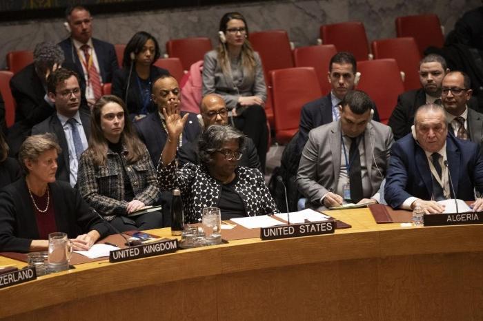 2月20日,在位于纽约的联合国总部,美国常驻联合国代表琳达·托马斯-格林菲尔德(前中)在安理会就决议草案进行表决时投反对票。新华社记者谢锷摄