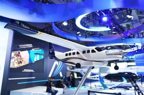2023年11月10日在第六届进博会汽车展区拍摄的安飞九座混动飞机模型。新华社记者金皓原摄