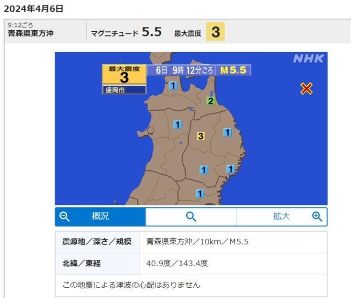 中新网4月6日电 据日本广播协会(NHK)报道,当地时间6日9时12分,日本青森县海域发生5.5级地震,震源深度10千米。