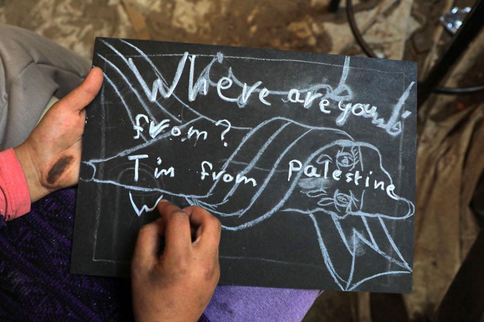 2023年12月28日,一名学生在加沙地带南部城市拉法一所学校的临时教室中写下“我来自巴勒斯坦”的字样。新华社发(里泽克·阿卜杜勒贾瓦德摄)
