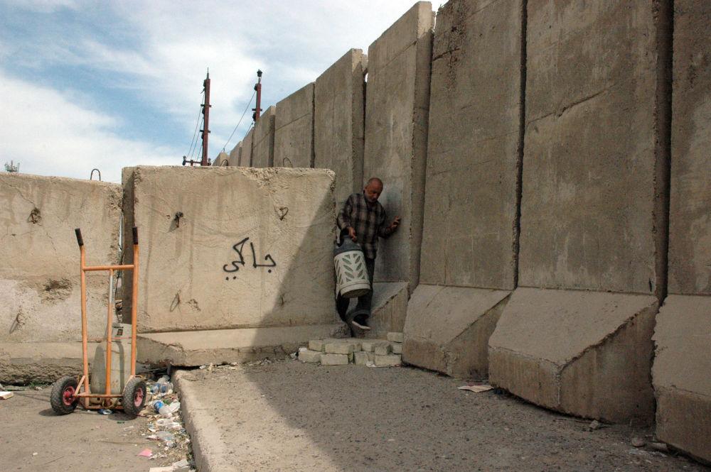2013年3月20日,在伊拉克首都巴格达,一名伊拉克人从防爆墙的缝隙之间穿过。新华社发(巴沙尔摄)