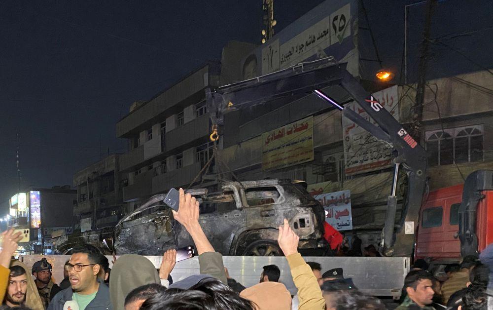 2024年2月7日,在伊拉克首都巴格达,民防部门转移遭无人机袭击的车辆。新华社发(哈利勒·达伍德摄)