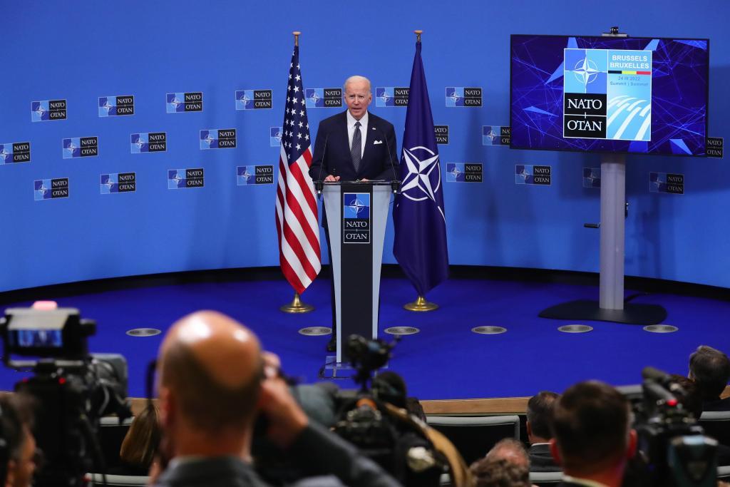 2022年3月24日,美国总统拜登在比利时布鲁塞尔的北约总部出席北约特别峰会后的新闻发布会。新华社记者郑焕松摄