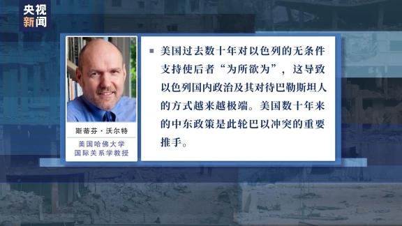 美国哈佛大学国际关系学教授斯蒂芬·沃尔特指出,美国过去数十年对以色列的无条件支持使后者“为所欲为”,这导致以色列国内政治及其对待巴勒斯坦人的方式越来越极端。美国数十年来的中东政策是此轮巴以冲突的重要推手。