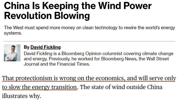近日,美国专栏作家戴维·菲克林发文说,美国和欧洲多国政府热衷于将性价比高的中国绿色产品排除在外,这种经济上的保护主义将会延缓全球能源转型。菲克林指出,即便阻挡来自外部的产品,美国自身的新能源行业发展依然“萎靡不振”。