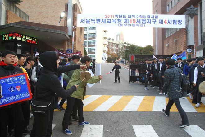 2016年11月17日,在韩国首尔一所高中,一位考生走进考场。新华社记者姚琪琳摄