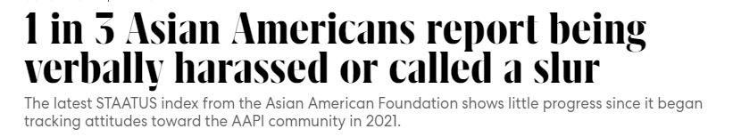 认知差距: 只有三分之一的美国人认为对亚裔美国人的仇恨有所增加,总体而言,人们认为对亚裔美国人社区的公平程度有所提高。但是,近三分之一的受访亚裔美国人表示受到过言语骚扰或被人辱骂。这个数字在东南亚裔美国人中上升到40%。大约 40% 的亚裔美国人认为他们会受到人身攻击,60% 的亚裔美国人认为他们会在未来五年内受到歧视。