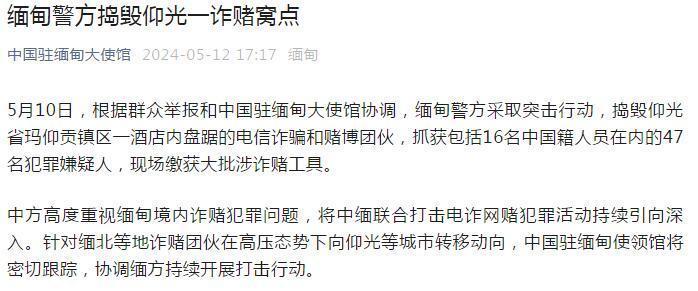 5月10日,根据群众举报和中国驻缅甸大使馆协调,缅甸警方采取突击行动,捣毁仰光省玛仰贡镇区一酒店内盘踞的电信诈骗和赌博团伙,抓获包括16名中国籍人员在内的47名犯罪嫌疑人,现场缴获大批涉诈赌工具。