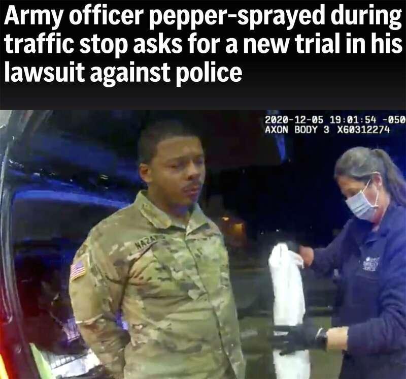 2020年12月,非洲和拉丁裔混血的美国陆军少尉卡伦·纳扎里奥在弗吉尼亚州温莎市驾驶新买的汽车回家途中,遭遇两名警察歧视性执法。后者不仅以“无照驾车”为由用枪威逼纳扎里奥下车,还对他进行殴打并使用胡椒喷雾。