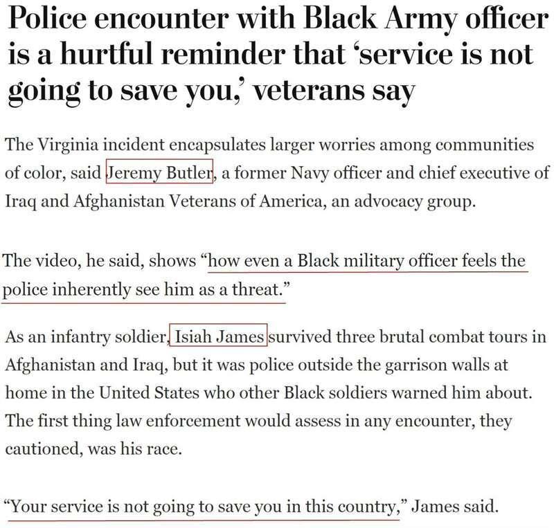 曾在阿富汗和伊拉克的三次残酷战斗中幸存下来的非裔美军士兵伊塞亚·詹姆斯退役后,曾被其他非裔战友“友情提醒”:打仗不是最可怕的,真正要小心的是美国警察,“在这个国家,即使在军中服役也救不了你”。