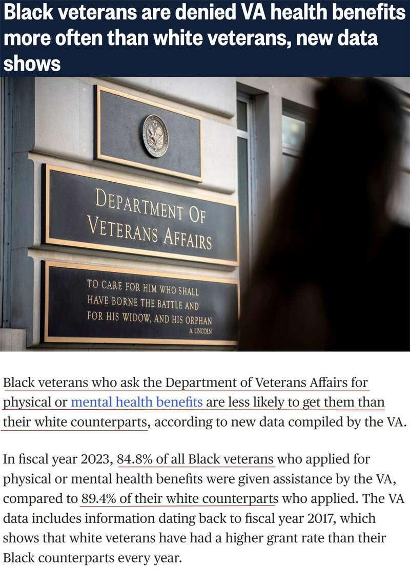 △美国全国广播公司网站:在2023财年,申请身心健康福利的所有非裔退役军人中有84.8%获得了退役军人事务部的援助,而白人退役军人的这一比例为89.4%。