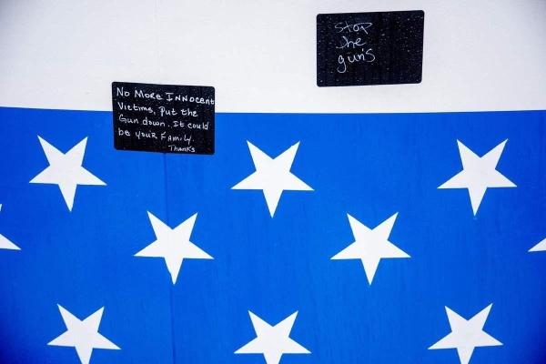 参观者们在互动装置处留言呼吁控枪。图片:法新社