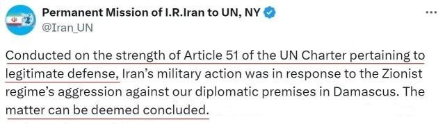 △在伊朗伊斯兰革命卫队当地时间4月13日晚到14日凌晨对以色列目标实施了有限的导弹和无人机袭击后,伊朗常驻联合国代表团通过社交平台发表声明称,此次行动是伊方根据《联合国宪章》第51条关于合法防卫的规定发起的,行动已经结束。