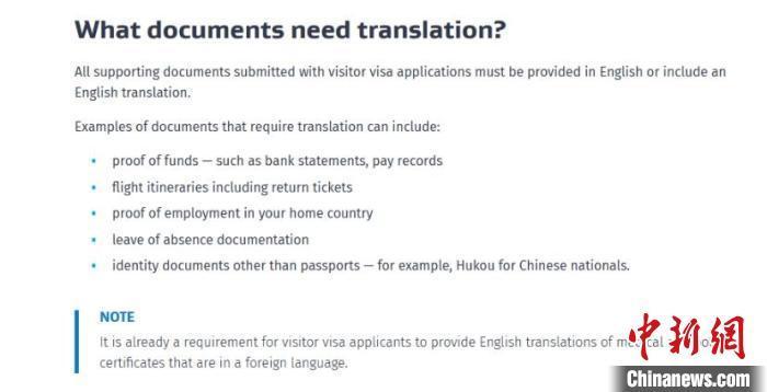 新西兰移民局官网列明,需要翻译成英文的文件包括资金证明,航班行程(包括返程机票),工作证明,休假证明文件和护照以外的身份证明文件等。