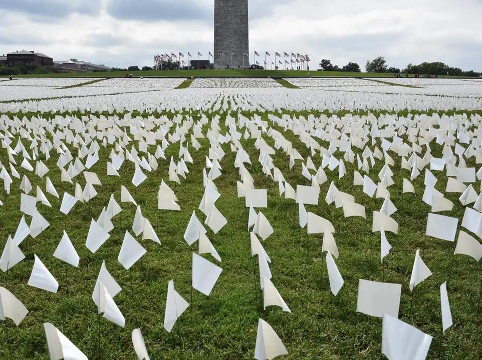 2021年9月,美国国家广场上代表因新冠死去的63万人的旗子(法新社)