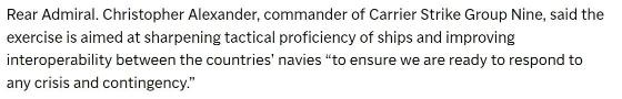 美国第九航母战斗群指挥官克里斯托弗·亚历山大则称,此次“自由之刃”演习旨在提高舰艇的战术熟练程度,增强三国海军之间的互操作性,“以确保我们做好应对任何危机和突发事件的准备”。